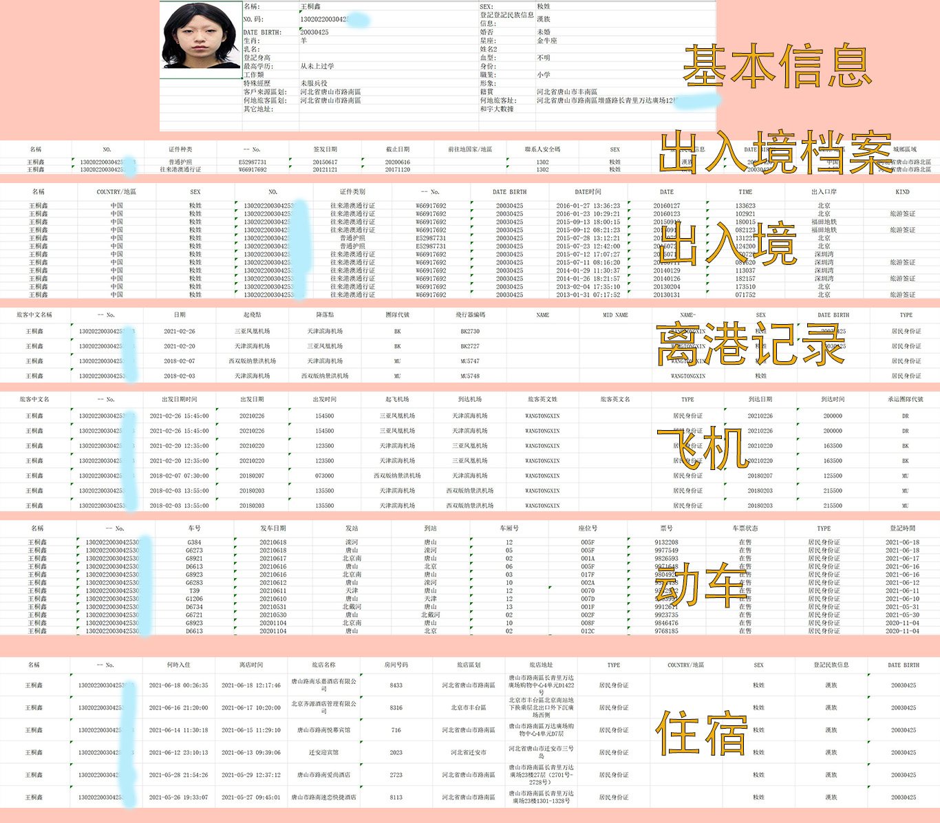 (个人行程记录+出入境记录综合查询+车辆+开房记录)具体用什么交通工具去了什么地方以及入住的酒店信息